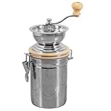 Manual coffee grinder with clip canister, 8" Stainless Steel with silicone seal. Adjusts for coarseness of grounds. Have fresh coffee every morning! Grounds stay fresh and stored right in the grinder.  To grind your beans just turn the handle.  Never worry about burning out your grinders motor, because this one is 100% manual, easy to operate.